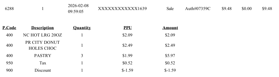 The next section shows a list of the items in the transaction. The first item is a 20 oz coffee, The next item is donut holes. The third item is three pastries, so fresh donuts, muffins, cinnamon rolls or the like. There’s also a $1.59 discount because donut holes and the coffee are set as a $2.99 deal.